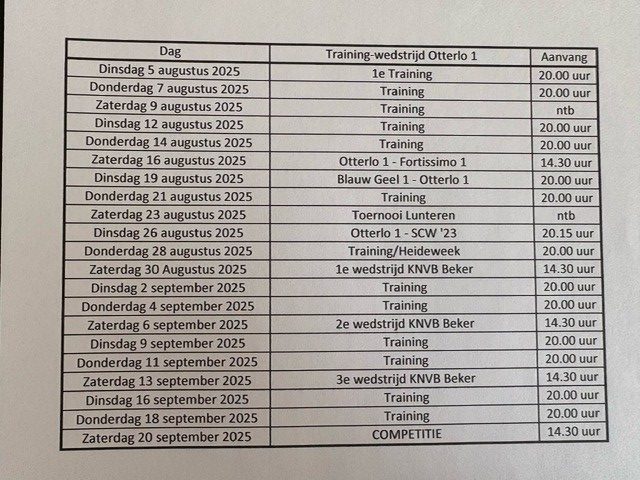 Bij SV Otterlo zijn de voorbereidingen voor het nieuwe voetbalseizoen inmiddels in volle gang. Onder leiding van onze nieuwe trainer Paul Bremer werkt het eerste elftal hard aan de vorm voor het komende jaar. De eerste krachtmeting laat niet lang op zich wachten: op zaterdag 30 augustus om 14.30 uur speelt Otterlo 1 in de beker tegen Groen-Wit ’62. We kijken uit naar een mooi seizoen en hopen jullie massaal langs de lijn te zien!
